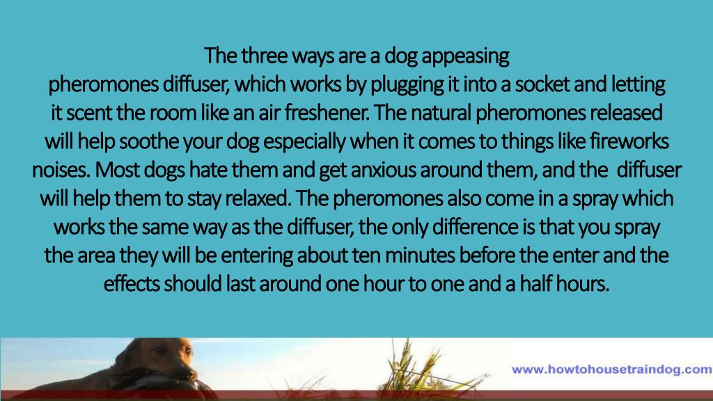 The three ways are a dog appeasing pheromones diffuser, which works by plugging it into a socket and letting it scent the room like an air freshener. The natural pheromones released will help soothe your dog especially when it comes to things like fireworks noises. Most dogs hate them and get anxious around them, and the diffuser will help them to stay relaxed. The pheromones also come in a spray which works the same way as the diffuser, the only difference is that you spray the area they will be entering about ten minutes before the enter and the effects should last around one hour to one and a half hours.