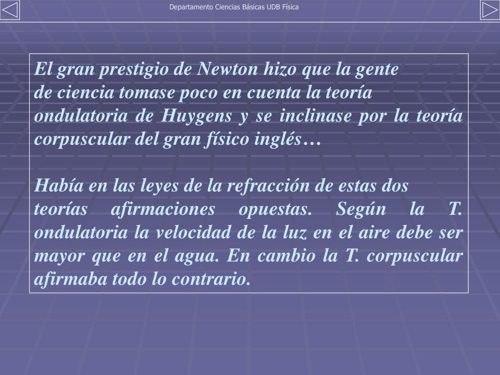 Departamento Ciencias Básicas UDB Física El gran prestigio de Newton hizo que la gente de ciencia tomase poco en cuenta la teoría ondulatoria de Huygens y se inclinase por la teoría corpuscular del gran físico inglés… Había en las leyes de la refracción de estas dos teorías afirmaciones opuestas. Según la T. ondulatoria la velocidad de la luz en el aire debe ser mayor que en el agua. En cambio la T. corpuscular afirmaba todo lo contrario.