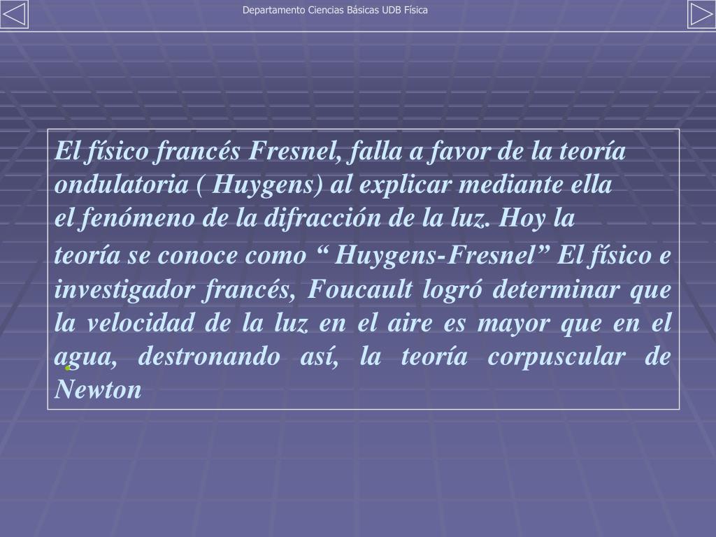 Departamento Ciencias Básicas UDB Física El físico francés Fresnel, falla a favor de la teoría ondulatoria ( Huygens) al explicar mediante ella el fenómeno de la difracción de la luz. Hoy la teoría se conoce como “ Huygens-Fresnel”El físico e investigador francés, Foucault logró determinar que la velocidad de la luz en el aire es mayor que en el agua, destronando así, la teoría corpuscular de Newton .