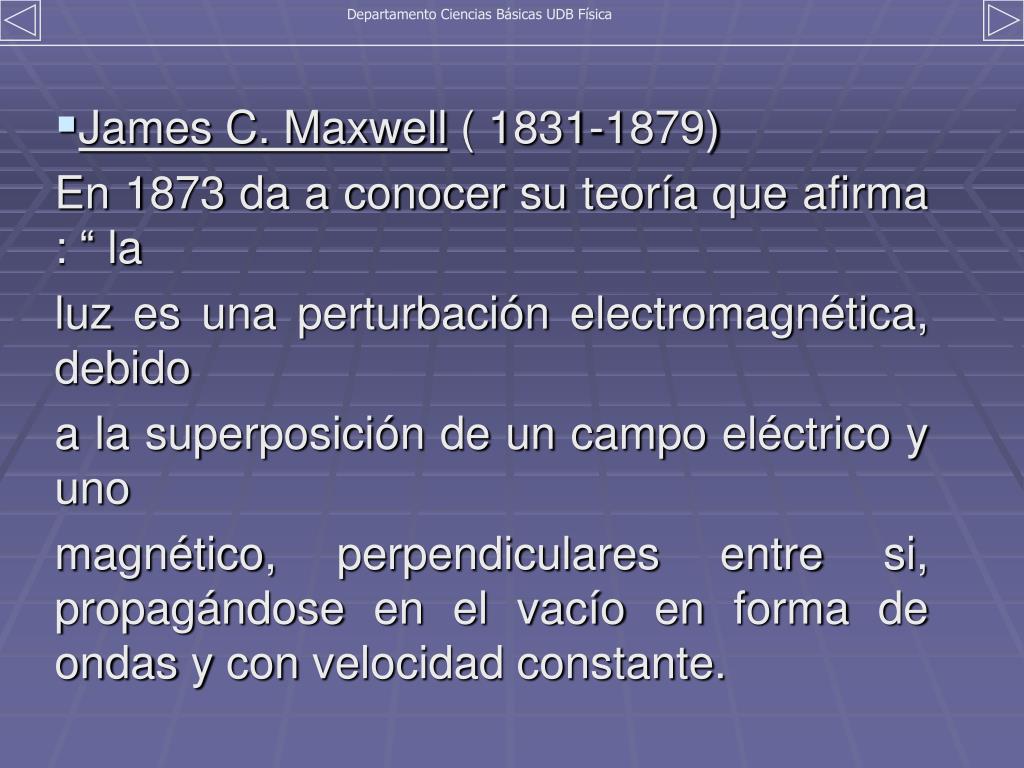 Departamento Ciencias Básicas UDB Física • James C. Maxwell ( 1831-1879) En 1873 da a conocer su teoría que afirma : “ la luz es una perturbación electromagnética, debido a la superposición de un campo eléctrico y uno magnético, perpendiculares entre si, propagándose en el vacío en forma de ondas y con velocidad constante.