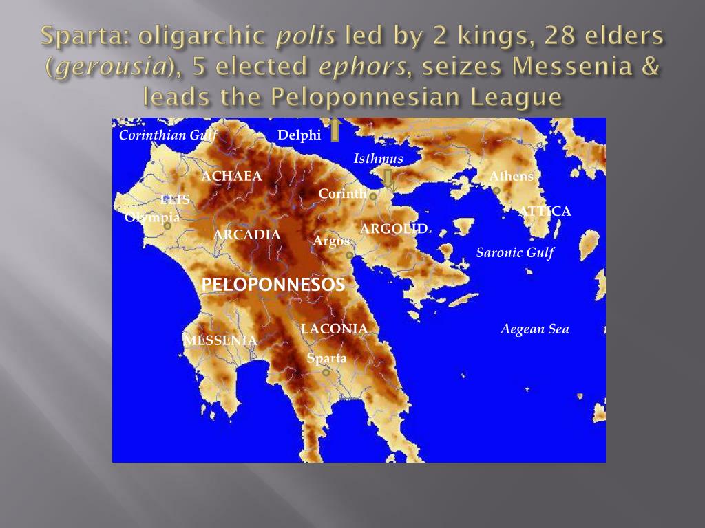 Sparta: oligarchic polis led by 2 kings, 28 elders (gerousia), 5 elected ephors, seizes Messenia & leads the Peloponnesian League Corinthian Gulf Delphi Isthmus ACHAEA Athens Corinth ELIS ATTICA Olympia ARGOLID ARCADIA Argos Saronic Gulf PELOPONNESOS LACONIA Aegean Sea MESSENIA Sparta