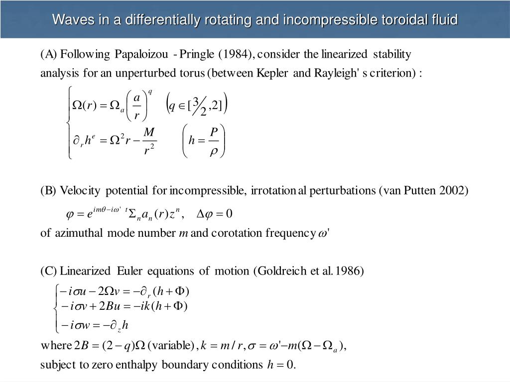 Linearized stability analysis for the torus Free surface waves on inner and outer boundaries mutually interact (Papaloizou-Pringle 1984) m=2 buckling mode