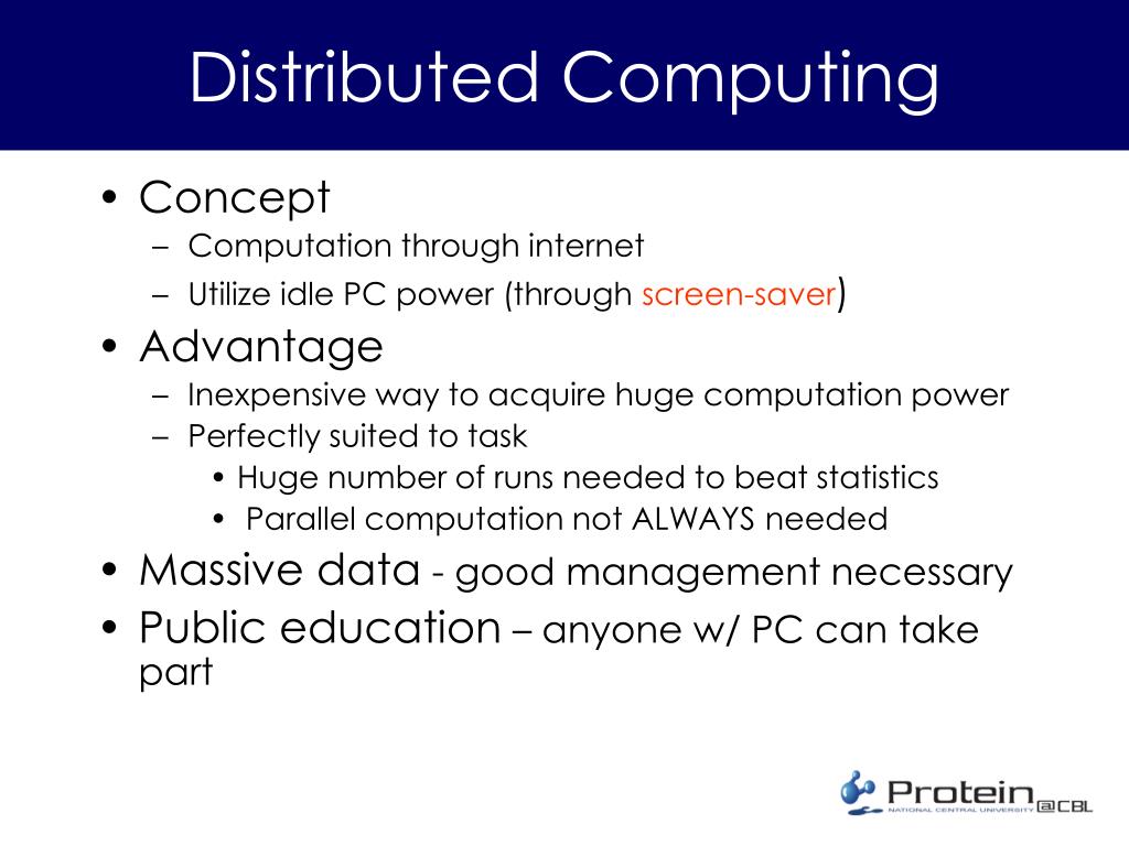 Distributed Computing • Concept • Computation through internet • Utilize idle PC power (through screen-saver) • Advantage • Inexpensive way to acquire huge computation power • Perfectly suited to task • Huge number of runs needed to beat statistics • Parallel computation not ALWAYS needed • Massive data - good management necessary • Public education – anyone w/ PC can take part