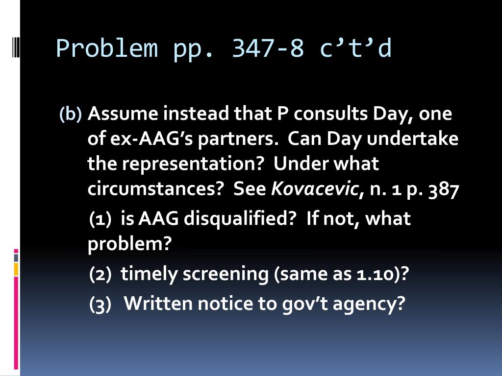 Problem pp. 347-8 c’t’d • Assume instead that P consults Day, one of ex-AAG’s partners. Can Day undertake the representation? Under what circumstances? See Kovacevic, n. 1 p. 387 (1) is AAG disqualified? If not, what problem? (2) timely screening (same as 1.10)? (3) Written notice to gov’t agency?