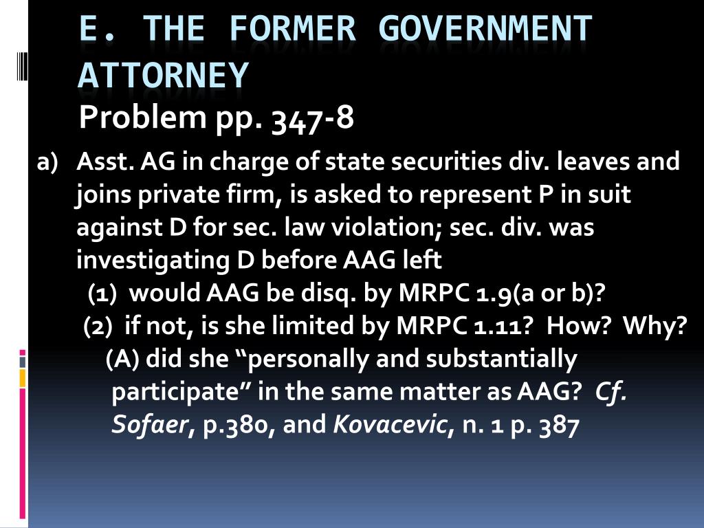 Asst. AG in charge of state securities div. leaves and joins private firm, is asked to represent P in suit against D for sec. law violation; sec. div. was investigating D before AAG left • (1) would AAG be disq. by MRPC 1.9(a or b)? • (2) if not, is she limited by MRPC 1.11? How? Why? • (A) did she “personally and substantially participate” in the same matter as AAG? Cf. Sofaer, p.380, and Kovacevic, n. 1 p. 387 Problem pp. 347-8 E. THE FORMER GOVERNMENT ATTORNEY