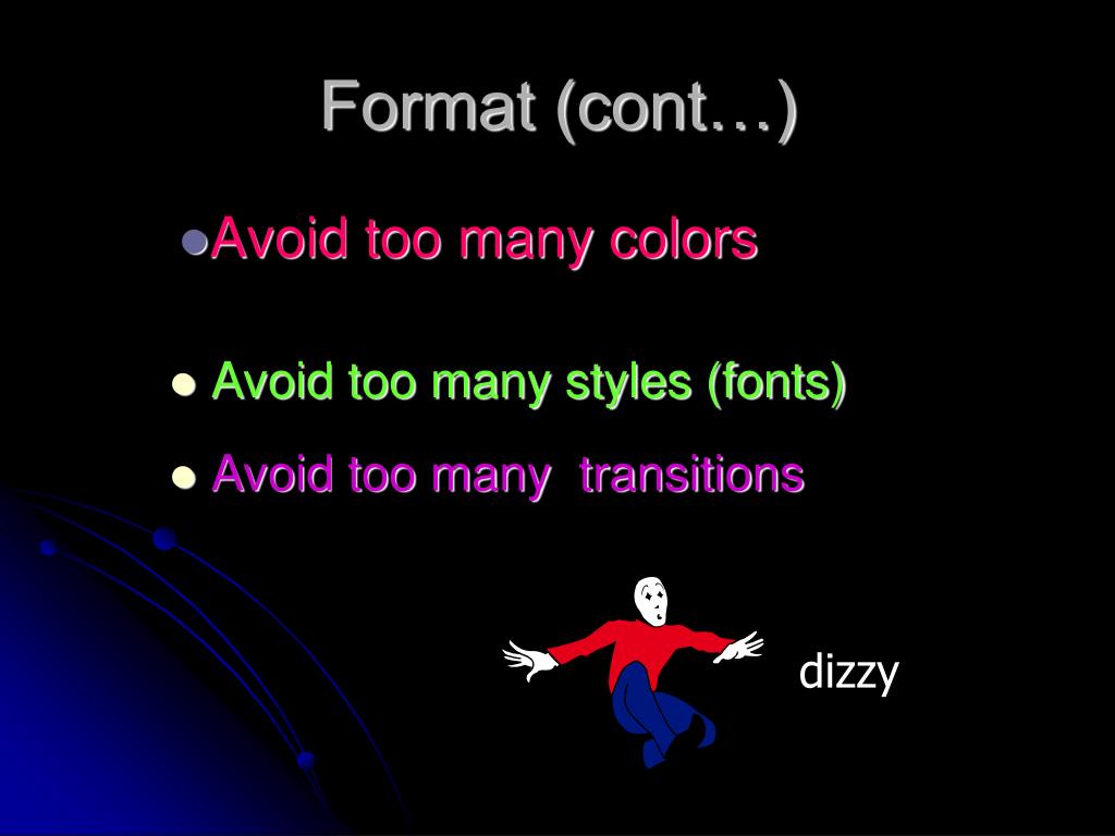 dizzy Format (cont…) • Avoid too many colors • Avoid too many styles (fonts) • Avoid too many transitions