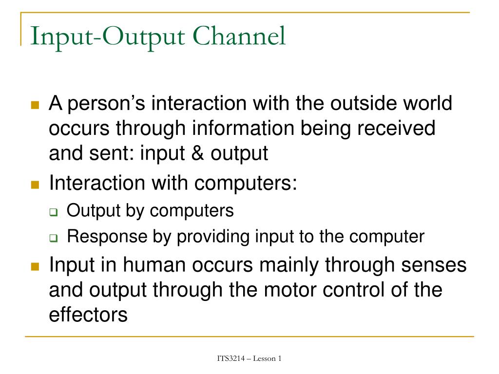 Input-Output Channel • A person’s interaction with the outside world occurs through information being received and sent: input & output • Interaction with computers: • Output by computers • Response by providing input to the computer • Input in human occurs mainly through senses and output through the motor control of the effectors ITS3214 – Lesson 1