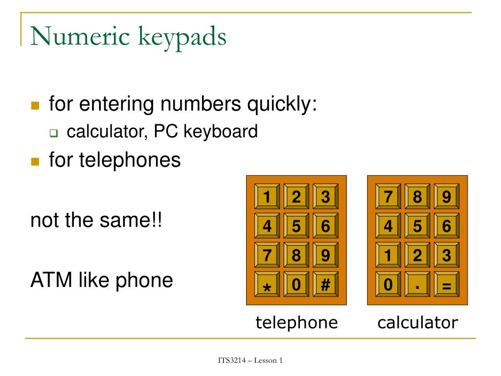1 2 3 7 8 9 4 5 6 4 5 6 7 8 9 1 2 3 * 0 # 0 . = Numeric keypads • for entering numbers quickly: • calculator, PC keyboard • for telephones not the same!! ATM like phone telephone calculator ITS3214 – Lesson 1