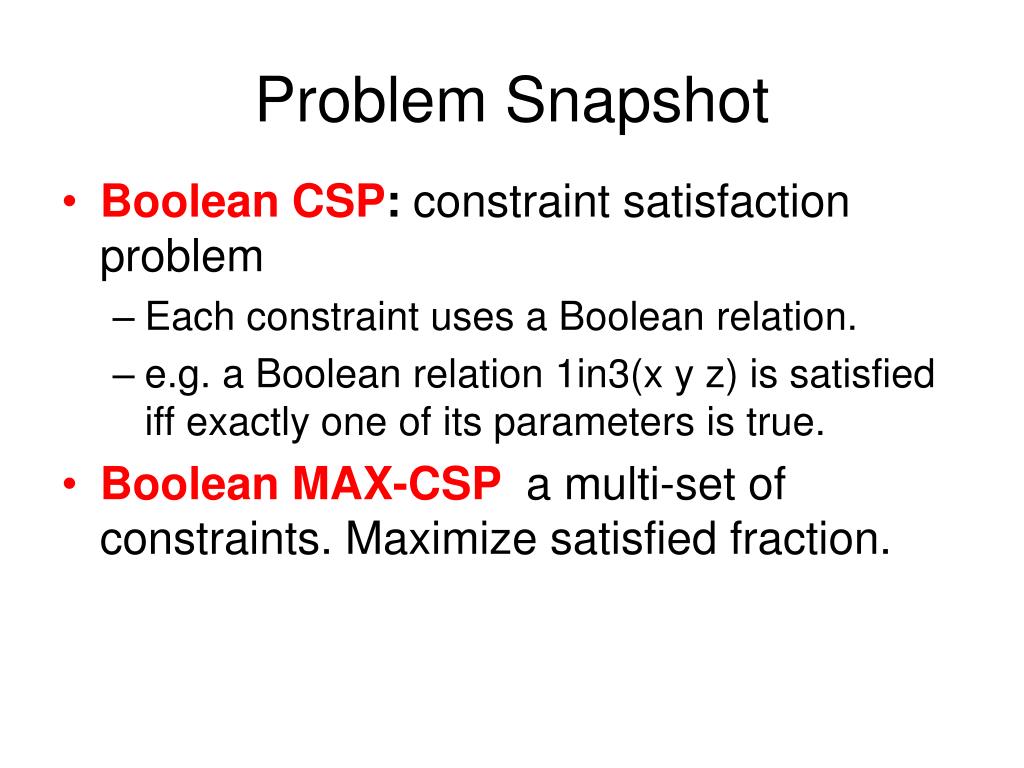 Problem Snapshot • Boolean CSP: constraint satisfaction problem • Each constraint uses a Boolean relation. • e.g. a Boolean relation 1in3(x y z) is satisfied iff exactly one of its parameters is true. • Boolean MAX-CSPa multi-set of constraints. Maximize satisfied fraction.
