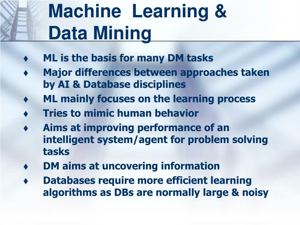 Machine Learning & Data Mining • ML is the basis for many DM tasks • Major differences between approaches taken by AI & Database disciplines • ML mainly focuses on the learning process • Tries to mimic human behavior • Aims at improving performance of an intelligent system/agent for problem solving tasks • DM aims at uncovering information • Databases require more efficient learning algorithms as DBs are normally large & noisy