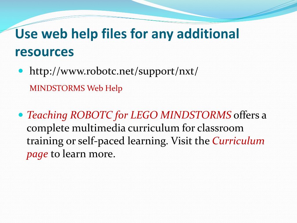 Use web help files for any additional resources • http://www.robotc.net/support/nxt/ MINDSTORMS Web Help • Teaching ROBOTC for LEGO MINDSTORMS offers a complete multimedia curriculum for classroom training or self-paced learning. Visit the Curriculum page to learn more.