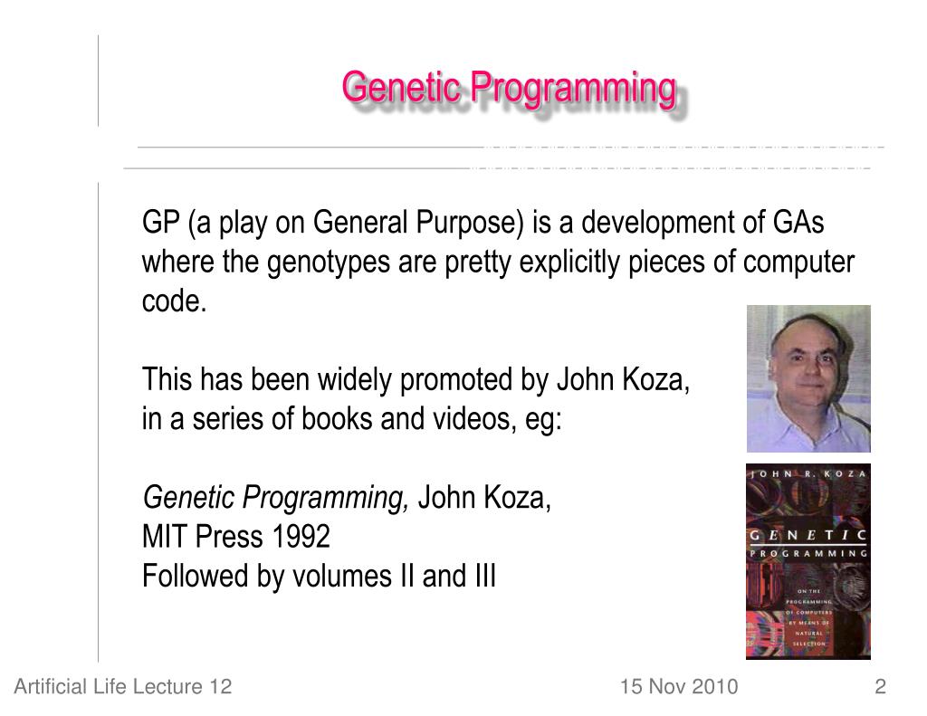 Genetic Programming GP (a play on General Purpose) is a development of GAs where the genotypes are pretty explicitly pieces of computer code. This has been widely promoted by John Koza, in a series of books and videos, eg: Genetic Programming, John Koza, MIT Press 1992 Followed by volumes II and III Artificial Life Lecture 12