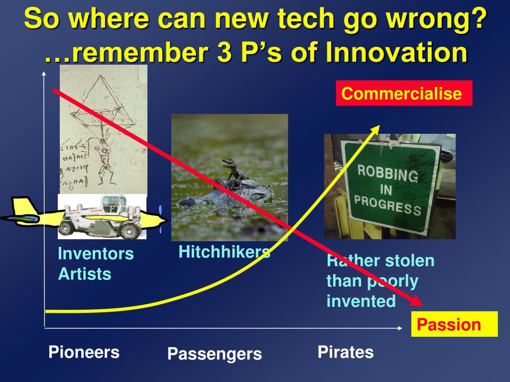 Commercialise Hitchhikers Rather stolen than poorly invented Pirates Passengers So where can new tech go wrong? …remember 3 P’s of Innovation InventorsArtists Passion Pioneers