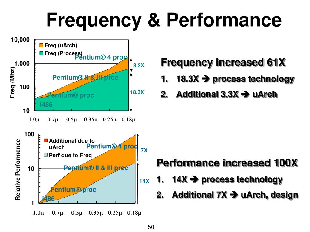 Frequency & Performance 100 Additional due to Pentium® 4 proc uArch 7X Perf due to Freq Relative Performance Pentium® II & III proc 10 14X Pentium® proc i486 1 1.0m 0.7m 0.5m 0.35m 0.25m 0.18m • Frequency increased 61X • 18.3X process technology • Additional 3.3X uArch • Performance increased 100X • 14X process technology • Additional 7X uArch, design