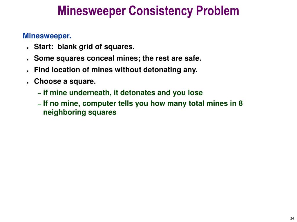 Minesweeper Consistency Problem • Minesweeper. • Start: blank grid of squares. • Some squares conceal mines; the rest are safe. • Find location of mines without detonating any. • Choose a square. • if mine underneath, it detonates and you lose • If no mine, computer tells you how many total mines in 8 neighboring squares