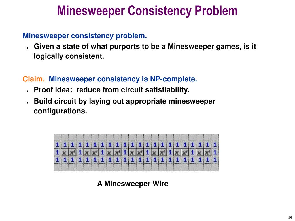 Minesweeper Consistency Problem • Minesweeper consistency problem. • Given a state of what purports to be a Minesweeper games, is it logically consistent. • Claim. Minesweeper consistency is NP-complete. • Proof idea: reduce from circuit satisfiability. • Build circuit by laying out appropriate minesweeper configurations. A Minesweeper Wire
