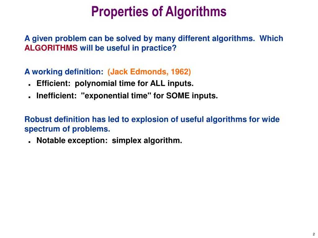 Properties of Algorithms • A given problem can be solved by many different algorithms. Which ALGORITHMS will be useful in practice? • A working definition: (Jack Edmonds, 1962) • Efficient: polynomial time for ALL inputs. • Inefficient: "exponential time" for SOME inputs. • Robust definition has led to explosion of useful algorithms for wide spectrum of problems. • Notable exception: simplex algorithm.