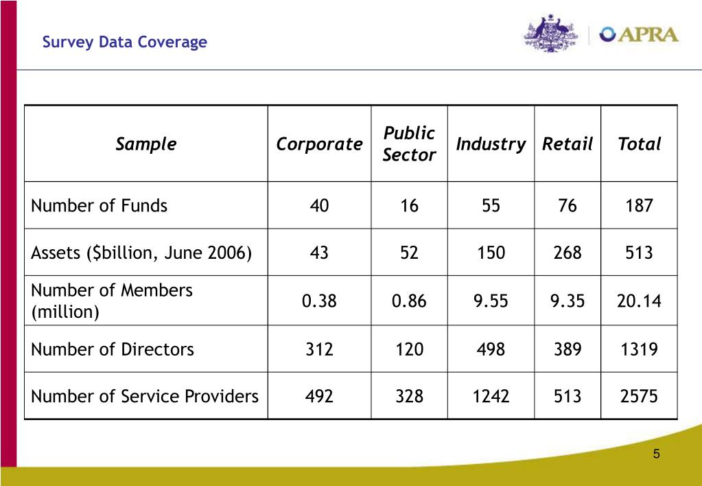 Pension Fund Survey 2006 APRA data collection since 1996 suggests systematic differences in investment returns (Retail returns are 2-3% pa less than those of other funds, not fully explained by volatility differences) Two questionnaires: 1. Trustee governance: policies and practices 2. Investment performance: risk adjusted (AA data) High quality data: Design input from industry and other regulators Tested with a pilot survey of 15 funds in 2005 Response was compulsory by law Streamlined with multiple choice questions Data validation before submission Comprehensive: all funds with more than $200M