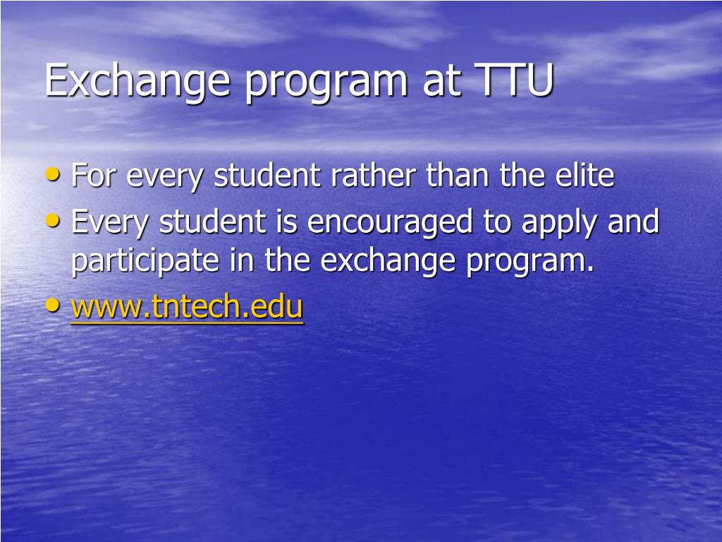 Exchange program at TTU • For every student rather than the elite • Every student is encouraged to apply and participate in the exchange program. • www.tntech.edu