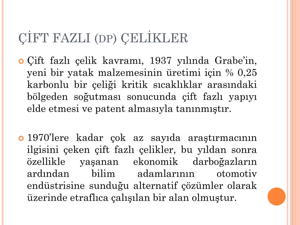 ÇİFT FAZLI (dp) ÇELİKLER • Çift fazlı çelik kavramı, 1937 yılında Grabe’in, yeni bir yatak malzemesinin üretimi için % 0,25 karbonlu bir çeliği kritik sıcaklıklar arasındaki bölgeden soğutması sonucunda çift fazlı yapıyı elde etmesi ve patent almasıyla tanınmıştır. • 1970’lere kadar çok az sayıda araştırmacının ilgisini çeken çift fazlı çelikler, bu yıldan sonra özellikle yaşanan ekonomik darboğazların ardından bilim adamlarının otomotiv endüstrisine sunduğu alternatif çözümler olarak üzerinde etraflıca çalışılan bir alan olmuştur.