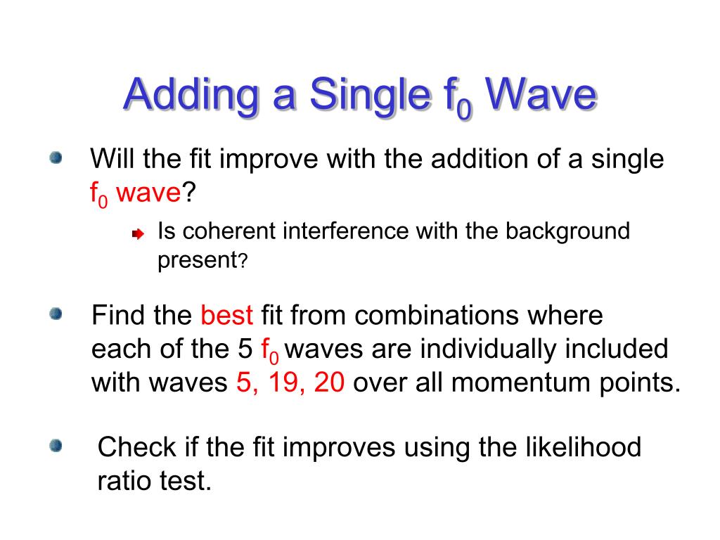 Adding a Single f0 Wave Will the fit improve with the addition of a single f0 wave? Is coherent interference with the background present? Find the best fit from combinations where each of the 5 f0 waves are individually included with waves 5, 19, 20 over all momentum points. Check if the fit improves using the likelihood ratio test.