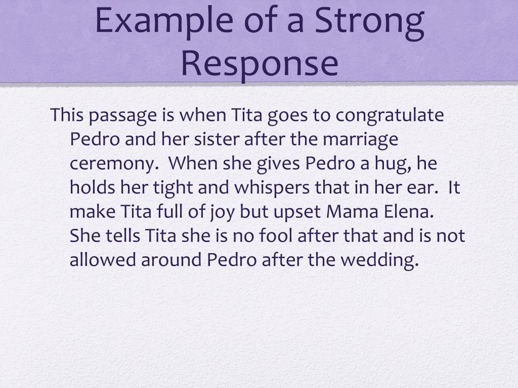 Example of a Strong Response This passageiswhen Tita goes to congratulate Pedro and her sister after the marriage ceremony. When she gives Pedro a hug, he holds her tight and whispers that in her ear. It make Tita full of joy but upset Mama Elena. She tells Tita she is no fool after that and is not allowed around Pedro after the wedding.