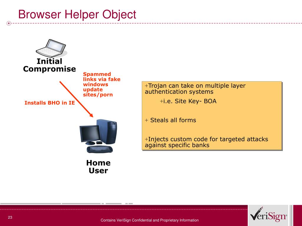 Initial Compromise Home User Browser Helper Object Spammed links via fake windows update sites/porn • Trojan can take on multiple layer authentication systems • i.e. Site Key- BOA • Steals all forms • Injects custom code for targeted attacks against specific banks Installs BHO in IE Contains VeriSign Confidential and Proprietary Information