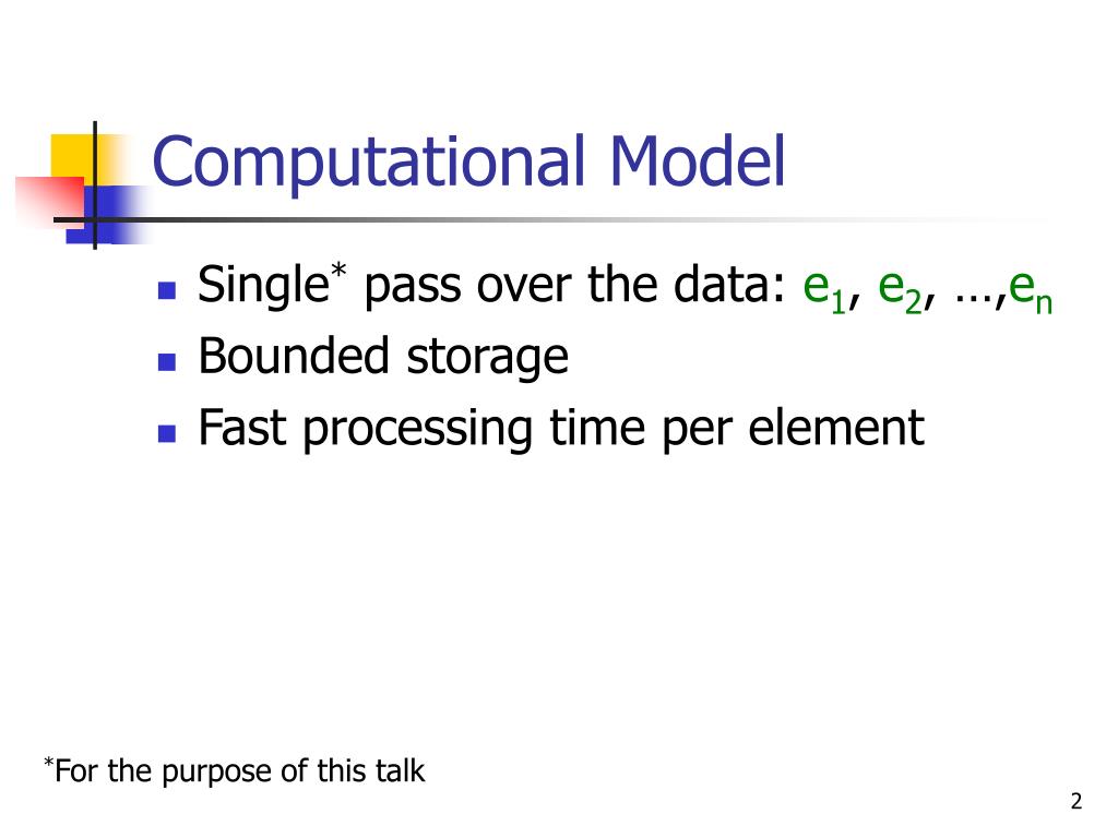 Computational Model • Single* pass over the data: e1, e2, …,en • Bounded storage • Fast processing time per element *For the purpose of this talk