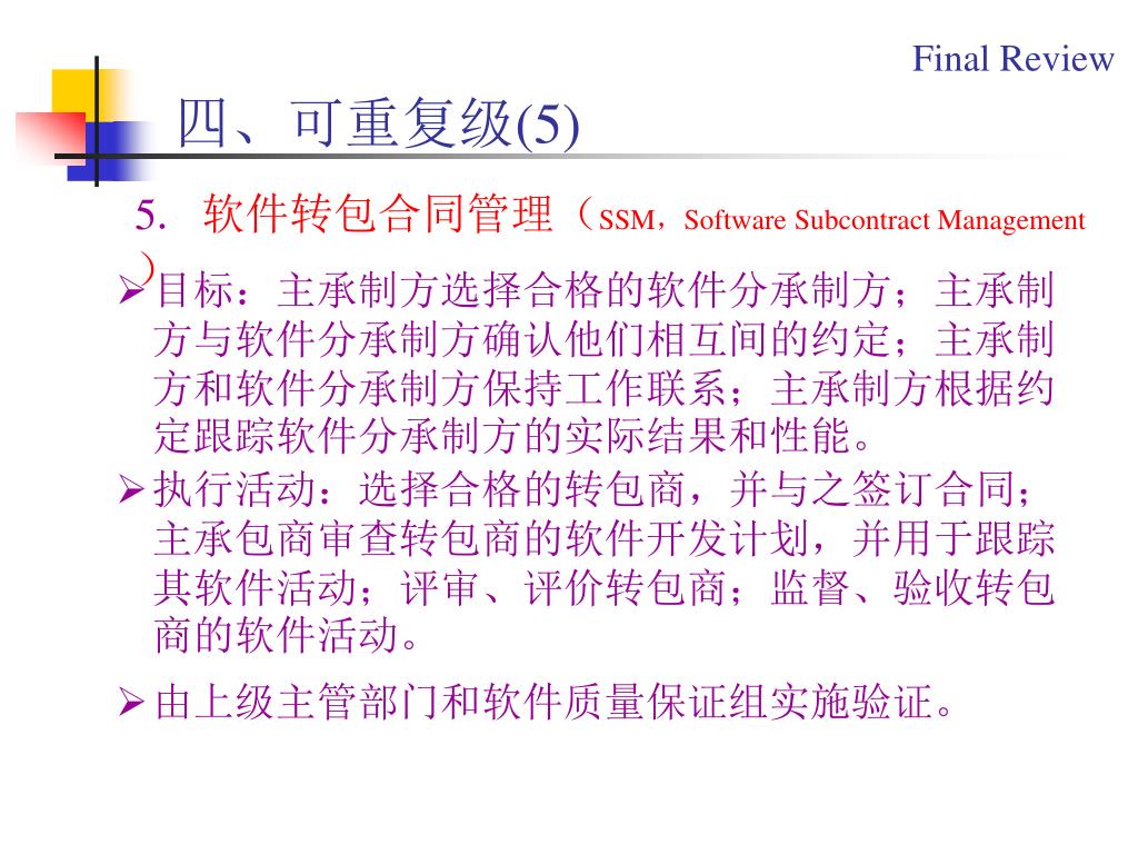 四、可重复级(5) Final Review 5. 软件转包合同管理(SSM,Software Subcontract Management) • 目标:主承制方选择合格的软件分承制方;主承制方与软件分承制方确认他们相互间的约定;主承制方和软件分承制方保持工作联系;主承制方根据约定跟踪软件分承制方的实际结果和性能。 • 执行活动:选择合格的转包商,并与之签订合同;主承包商审查转包商的软件开发计划,并用于跟踪其软件活动;评审、评价转包商;监督、验收转包商的软件活动。 • 由上级主管部门和软件质量保证组实施验证。