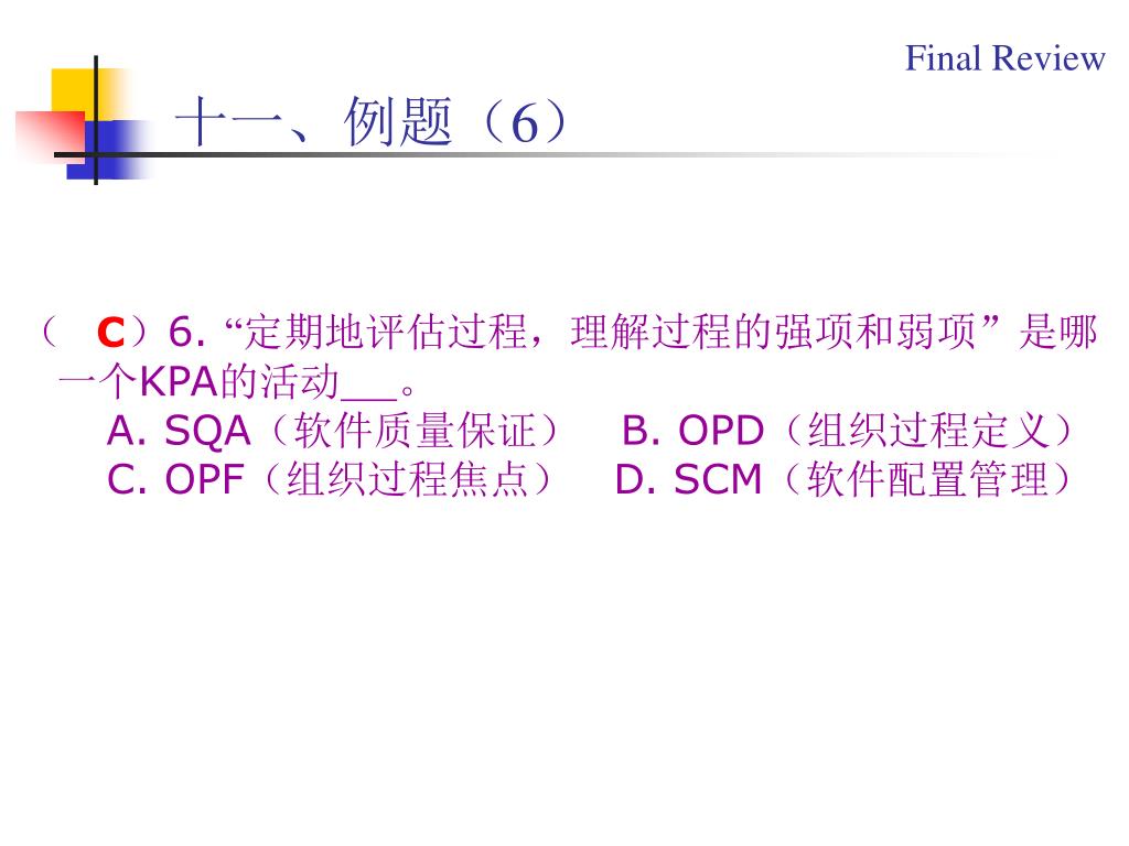 十一、例题(6) Final Review ()6. “定期地评估过程,理解过程的强项和弱项”是哪一个KPA的活动。 A. SQA(软件质量保证)B. OPD(组织过程定义) C. OPF(组织过程焦点)D. SCM(软件配置管理) C