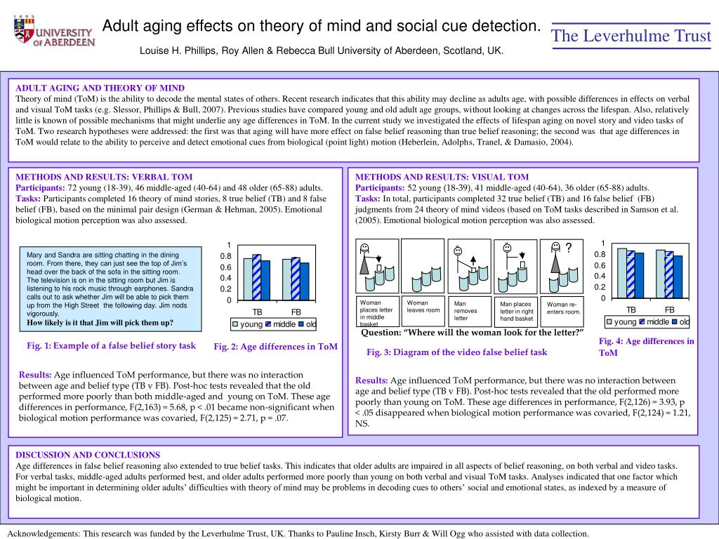 ? Woman places letter in middle basket Woman leaves room Man removes letter Man places letter in right hand basket Woman re-enters room. The Leverhulme Trust Adult aging effects on theory of mind and social cue detection.Louise H. Phillips, Roy Allen & Rebecca Bull University of Aberdeen, Scotland, UK. ADULT AGING AND THEORY OF MIND Theory of mind (ToM) is the ability to decode the mental states of others. Recent research indicates that this ability may decline as adults age, with possible differences in effects on verbal and visual ToM tasks (e.g. Slessor, Phillips & Bull, 2007). Previous studies have compared young and old adult age groups, without looking at changes across the lifespan. Also, relatively little is known of possible mechanisms that might underlie any age differences in ToM. In the current study we investigated the effects of lifespan aging on novel story and video tasks of ToM. Two research hypotheses were addressed: the first was that aging will have more effect on false belief reasoning than true belief reasoning; the second was that age differences in ToM would relate to the ability to perceive and detect emotional cues from biological (point light) motion (Heberlein, Adolphs, Tranel, & Damasio, 2004). METHODS AND RESULTS: VERBAL TOM Participants: 72 young (18-39), 46 middle-aged (40-64) and 48 older (65-88) adults. Tasks: Participants completed 16 theory of mind stories, 8 true belief (TB) and 8 false belief (FB), based on the minimal pair design (German & Hehman, 2005). Emotional biological motion perception was also assessed. METHODS AND RESULTS: VISUAL TOM Participants: 52 young (18-39), 41 middle-aged (40-64), 36 older (65-88) adults. Tasks: In total, participants completed 32 true belief (TB) and 16 false belief (FB) judgments from 24 theory of mind videos (based on ToM tasks described in Samson et al. (2005). Emotional biological motion perception was also assessed. Mary and Sandra are sitting chatting in the dining room. From there, they can just see the top of Jim’s head over the back of the sofa in the sitting room. The television is on in the sitting room but Jim is listening to his rock music through earphones. Sandra calls out to ask whether Jim will be able to pick them up from the High Street the following day. Jim nods vigorously. How likely is it that Jim will pick them up? Question: “Where will the woman look for the letter?” Fig. 4: Age differences in ToM Fig. 1: Example of a false belief story task Fig. 2: Age differences in ToM Fig. 3: Diagram of the video false belief task Results: Age influenced ToM performance, but there was no interaction between age and belief type (TB v FB). Post-hoc tests revealed that the old performed more poorly than both middle-aged and young on ToM. These age differences in performance, F(2,163) = 5.68, p < .01 became non-significant when biological motion performance was covaried, F(2,125) = 2.71, p = .07. Results: Age influenced ToM performance, but there was no interaction between age and belief type (TB v FB). Post-hoc tests revealed that the old performed more poorly than young on ToM. These age differences in performance, F(2,126) = 3.93, p < .05 disappeared when biological motion performance was covaried, F(2,124) = 1.21, NS. DISCUSSION AND CONCLUSIONS Age differences in false belief reasoning also extended to true belief tasks. This indicates that older adults are impaired in all aspects of belief reasoning, on both verbal and video tasks. For verbal tasks, middle-aged adults performed best, and older adults performed more poorly than young on both verbal and visual ToM tasks. Analyses indicated that one factor which might be important in determining older adults’ difficulties with theory of mind may be problems in decoding cues to others’ social and emotional states, as indexed by a measure of biological motion. Acknowledgements: This research was funded by the Leverhulme Trust, UK. Thanks to Pauline Insch, Kirsty Burr & Will Ogg who assisted with data collection.