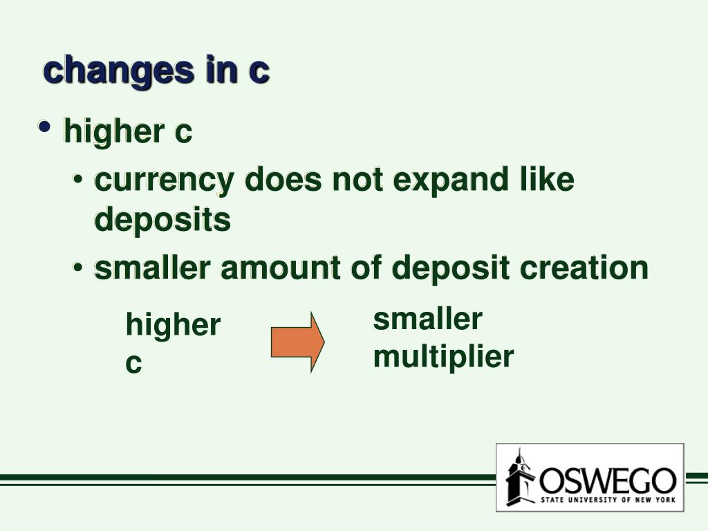 changes in c • higher c • currency does not expand like deposits • smaller amount of deposit creation smaller multiplier higher c