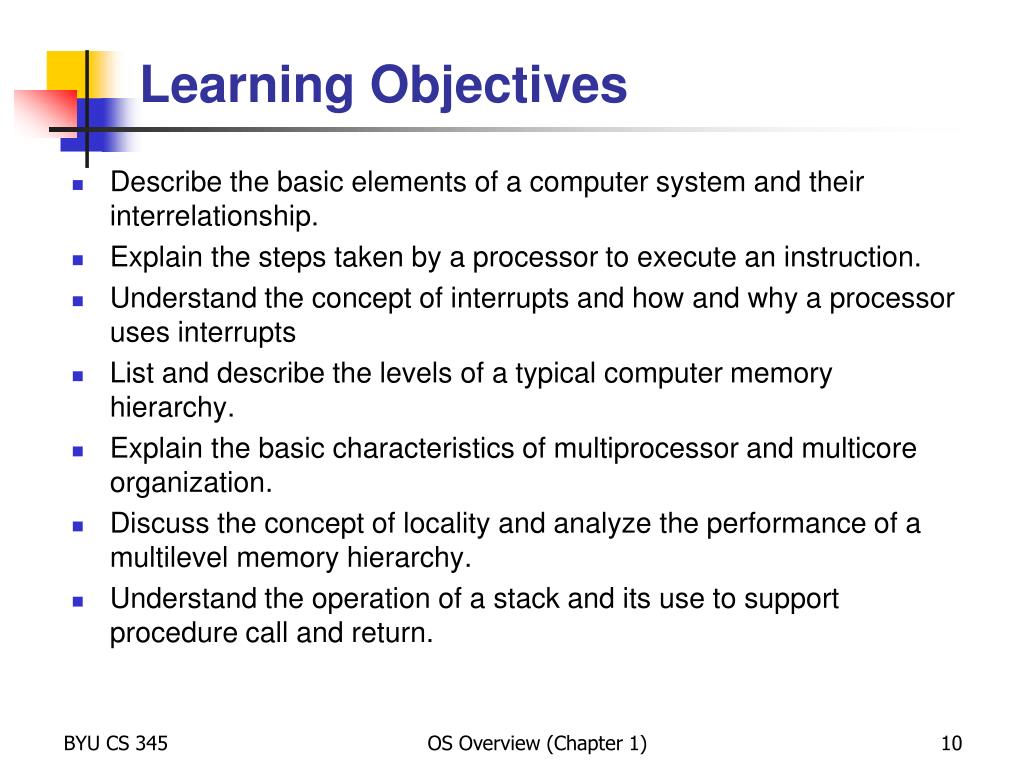 Learning Objectives • Describe the basic elements of a computer system and their interrelationship. • Explain the steps taken by a processor to execute an instruction. • Understand the concept of interrupts and how and why a processor uses interrupts • List and describe the levels of a typical computer memory hierarchy. • Explain the basic characteristics of multiprocessor and multicore organization. • Discuss the concept of locality and analyze the performance of a multilevel memory hierarchy. • Understand the operation of a stack and its use to support procedure call and return. OS Overview (Chapter 1)