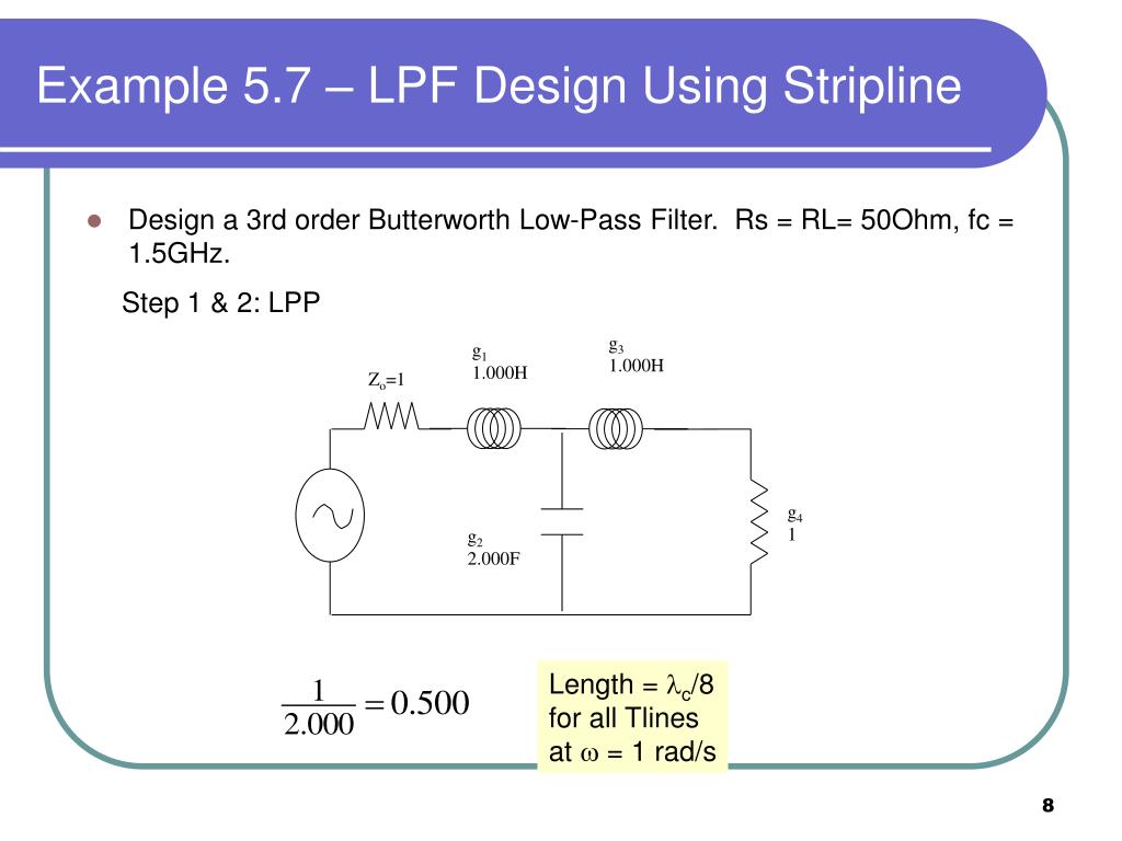 g3 1.000H g1 1.000H Zo=1 g4 1 g2 2.000F Example 5.7 – LPF Design Using Stripline • Design a 3rd order Butterworth Low-Pass Filter. Rs = RL= 50Ohm, fc = 1.5GHz. Step 1 & 2: LPP Length = c/8 for all Tlines at = 1 rad/s