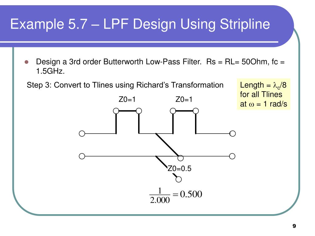 Example 5.7 – LPF Design Using Stripline • Design a 3rd order Butterworth Low-Pass Filter. Rs = RL= 50Ohm, fc = 1.5GHz. Step 3: Convert to Tlines using Richard’s Transformation Length = c/8 for all Tlines at = 1 rad/s