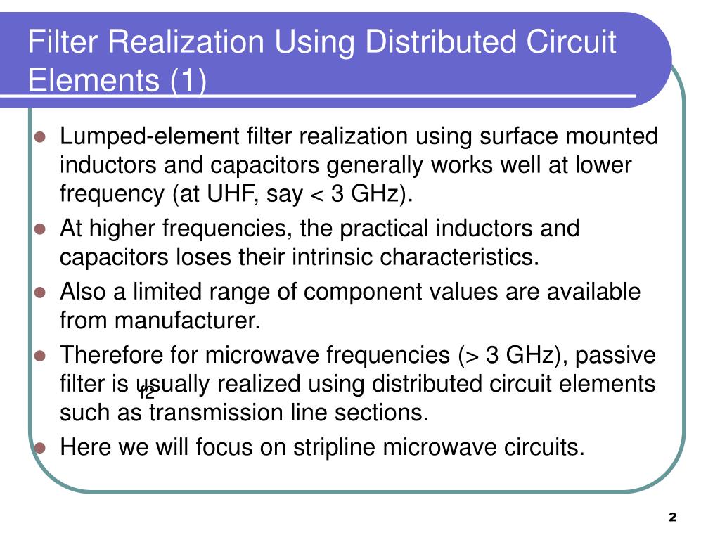 Filter Realization Using Distributed Circuit Elements (1) • Lumped-element filter realization using surface mounted inductors and capacitors generally works well at lower frequency (at UHF, say < 3 GHz). • At higher frequencies, the practical inductors and capacitors loses their intrinsic characteristics. • Also a limited range of component values are available from manufacturer. • Therefore for microwave frequencies (> 3 GHz), passive filter is usually realized using distributed circuit elements such as transmission line sections. • Here we will focus on stripline microwave circuits. f2
