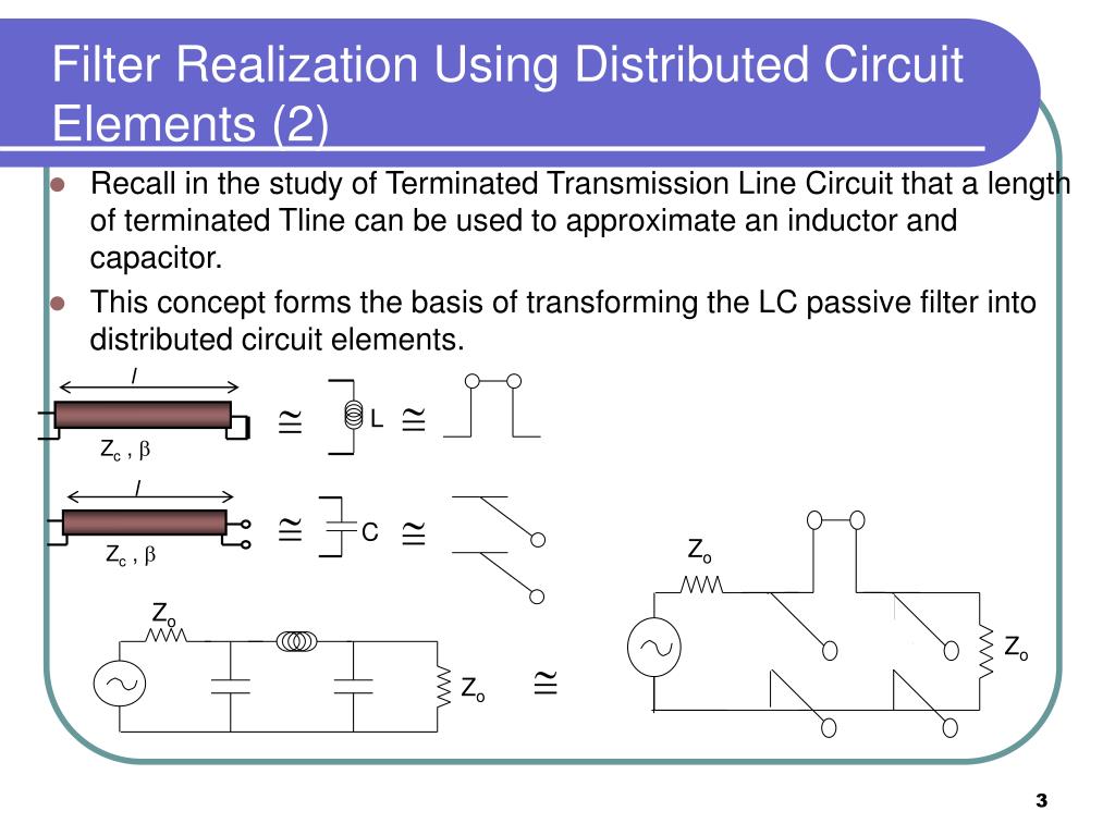 Zo l l C L Zo Zc , Zc , Zo Zo Filter Realization Using Distributed Circuit Elements (2) • Recall in the study of Terminated Transmission Line Circuit that a length of terminated Tline can be used to approximate an inductor and capacitor. • This concept forms the basis of transforming the LC passive filter into distributed circuit elements.