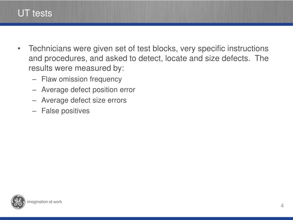 UT tests • Technicians were given set of test blocks, very specific instructions and procedures, and asked to detect, locate and size defects. The results were measured by: • Flaw omission frequency • Average defect position error • Average defect size errors • False positives