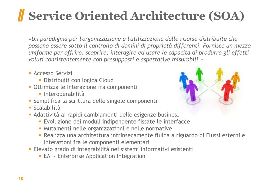 Service Oriented Architecture (SOA) «Un paradigma per l'organizzazione e l'utilizzazione delle risorse distribuite che possono essere sotto il controllo di domini di proprietà differenti. Fornisce un mezzo uniforme per offrire, scoprire, interagire ed usare le capacità di produrre gli effetti voluti consistentemente con presupposti e aspettative misurabili.» • Accesso Servizi • Distribuiti con logica Cloud • Ottimizza le Interazione fra componenti • Interoperabilità • Semplifica la scrittura delle singole componenti • Scalabilità • Adattività ai rapidi cambiamenti delle esigenze business • Evoluzione dei moduli indipendente fissate le interfacce • Mutamenti nelle organizzazioni e nelle normative • Realizza una architettura intrinsecamente fluida a riguardo di Flussi esterni e Interazioni fra le componenti elementari • Elevato grado di integrabilità nei sistemi informativi esistenti • EAI - Enterprise Application Integration