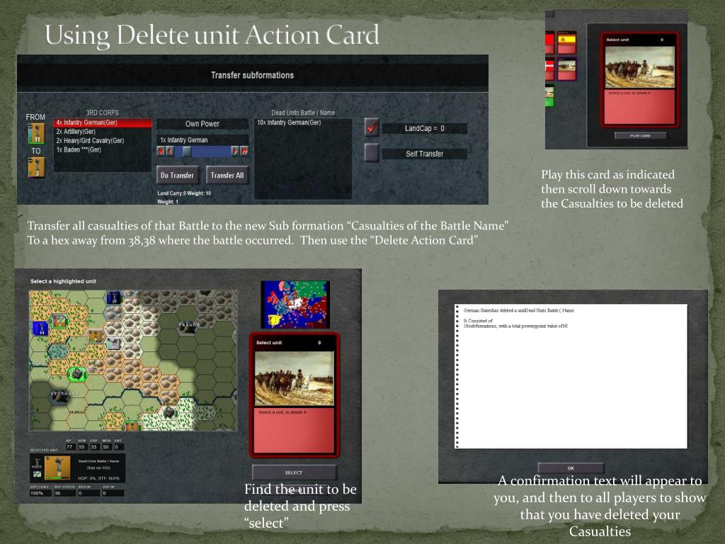 Using Delete unit Action Card Play this card as indicated then scroll down towards the Casualties to be deleted Transfer all casualties of that Battle to the new Sub formation “Casualties of the Battle Name” To a hex away from 38,38 where the battle occurred. Then use the “Delete Action Card” • A confirmation text will appear to you, and then to all players to show that you have deleted your Casualties Find the unit to be deleted and press “select”
