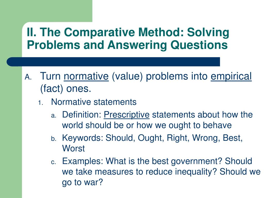 II. The Comparative Method: Solving Problems and Answering Questions • Turn normative (value) problems into empirical (fact) ones. • Normative statements • Definition: Prescriptive statements about how the world should be or how we ought to behave • Keywords: Should, Ought, Right, Wrong, Best, Worst • Examples: What is the best government? Should we take measures to reduce inequality? Should we go to war?