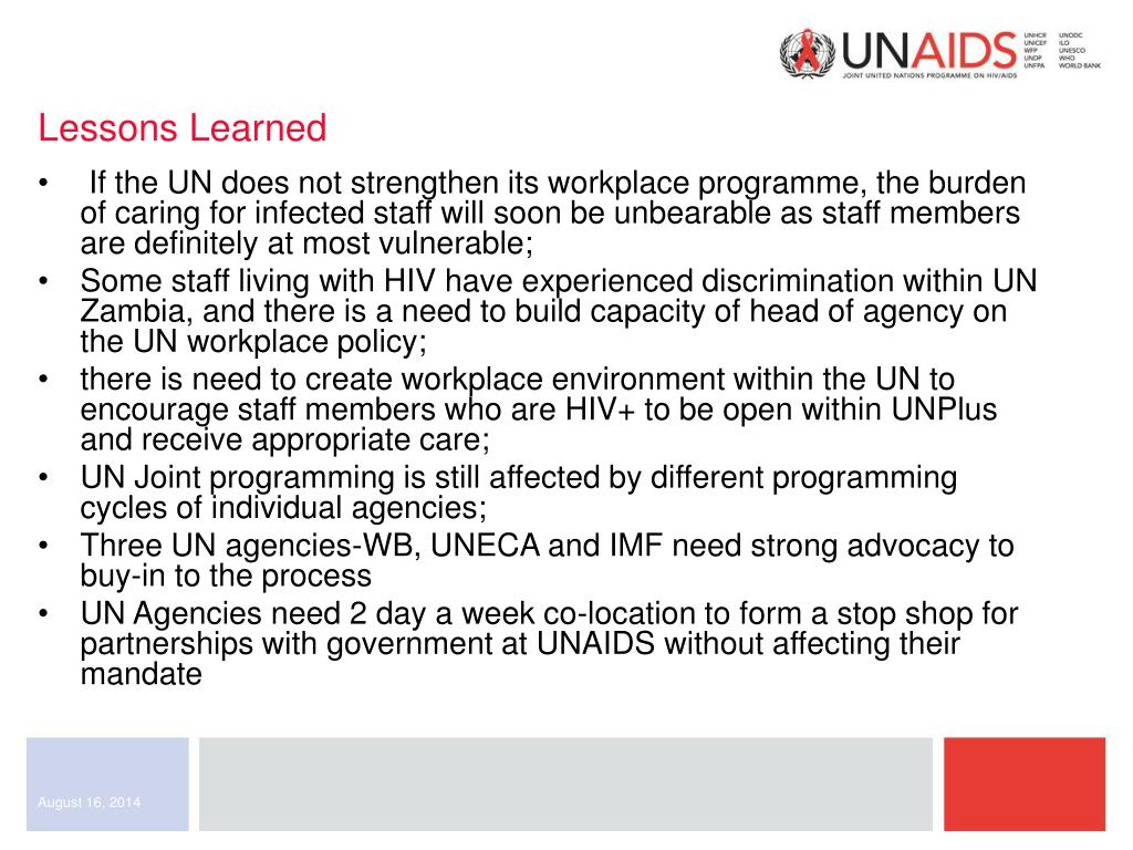 Lessons Learned • If the UN does not strengthen its workplace programme, the burden of caring for infected staff will soon be unbearable as staff members are definitely at most vulnerable; • Some staff living with HIV have experienced discrimination within UN Zambia, and there is a need to build capacity of head of agency on the UN workplace policy; • there is need to create workplace environment within the UN to encourage staff members who are HIV+ to be open within UNPlus and receive appropriate care; • UN Joint programming is still affected by different programming cycles of individual agencies; • Three UN agencies-WB, UNECA and IMF need strong advocacy to buy-in to the process • UN Agencies need 2 day a week co-location to form a stop shop for partnerships with government at UNAIDS without affecting their mandate