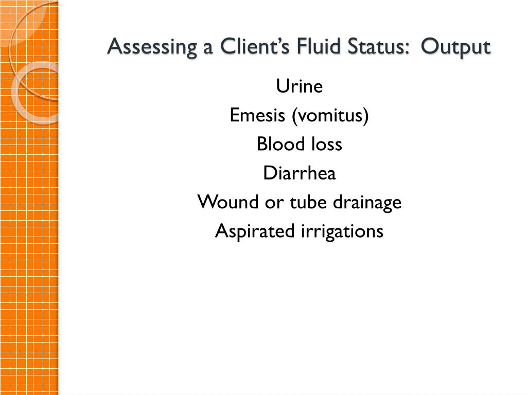 Assessing a Client’s Fluid Status: Output Urine Emesis (vomitus) Blood loss Diarrhea Wound or tube drainage Aspirated irrigations