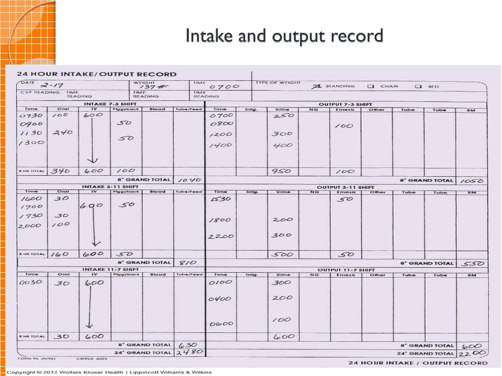 Assessing a Client’s Fluid Status • Intake and output (I&O) measurement: one tool to assess fluid status by keeping record over a 24hr period. • Intake: Sum of all fluid consumed/instilled • Output: Sum of liquid eliminated from the body