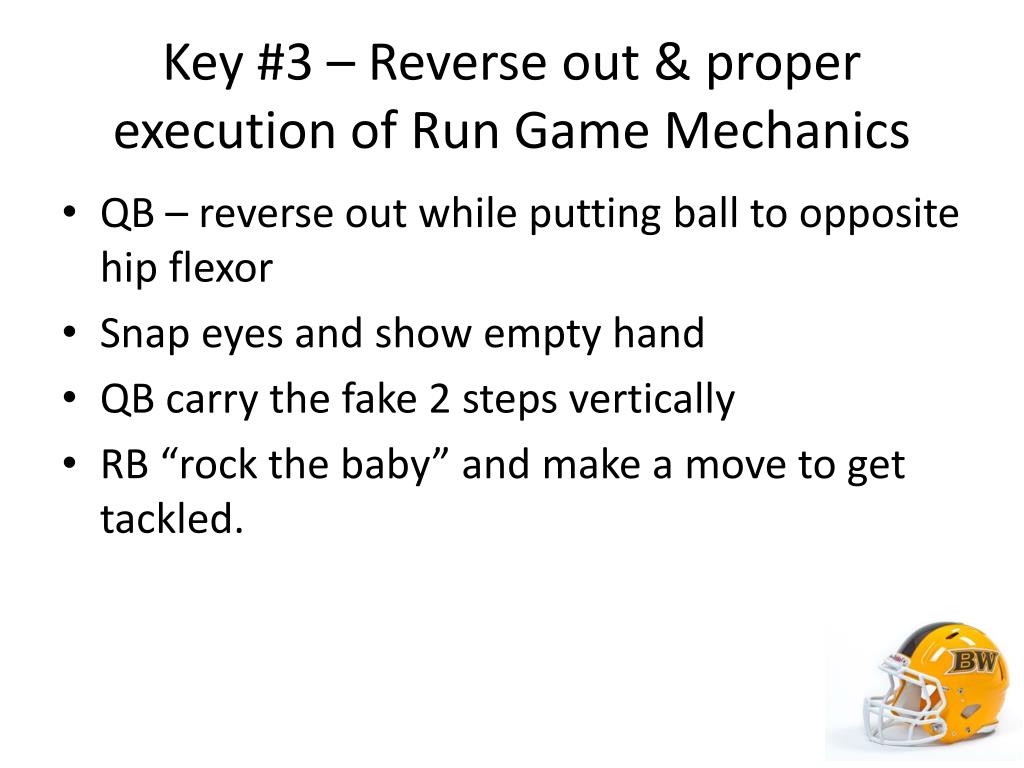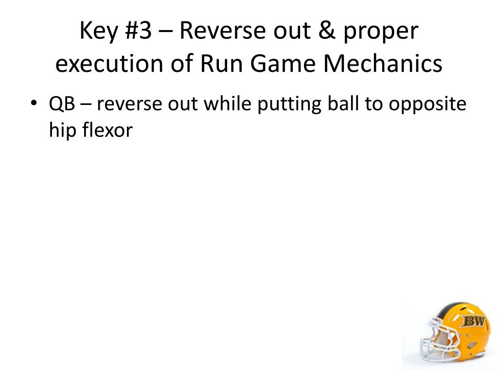 Key #3 – Reverse out & proper execution of Run Game Mechanics • QB – reverse out while putting ball to opposite hip flexor