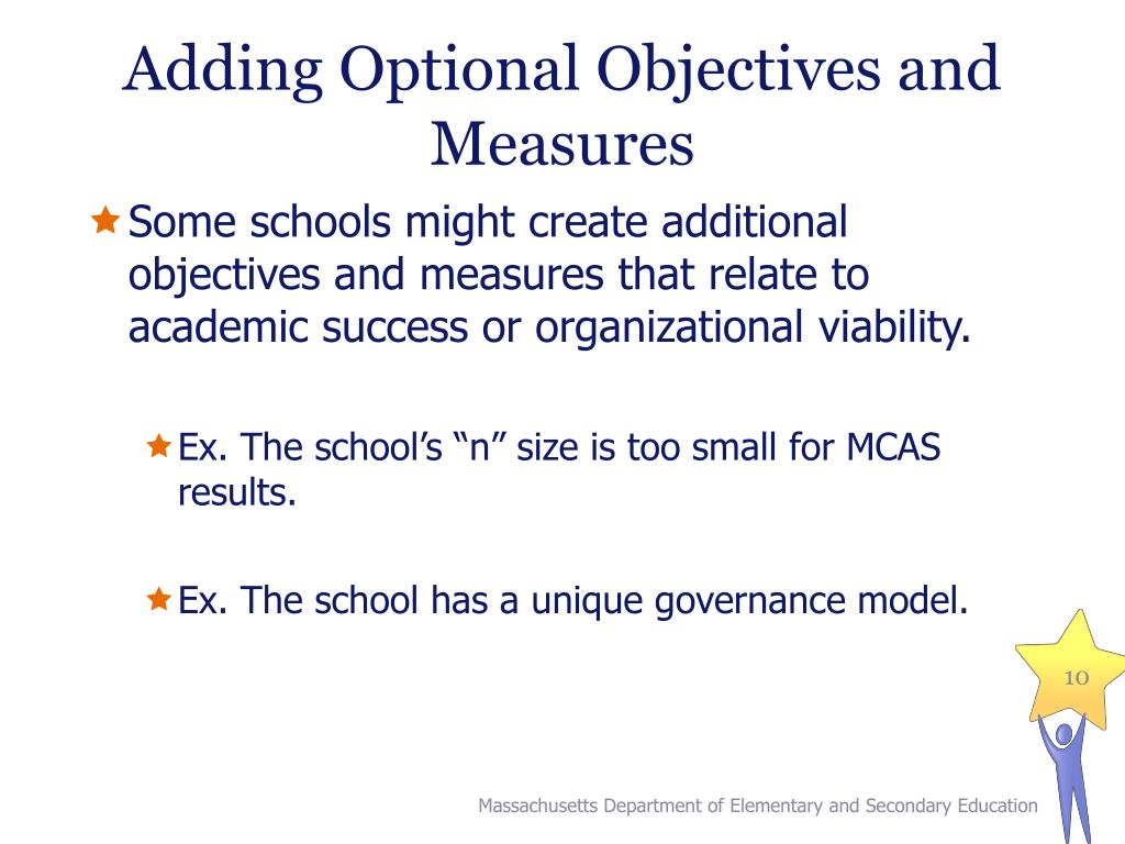 Adding Optional Objectives and Measures • Some schools might create additional objectives and measures that relate to academic success or organizational viability. • Ex. The school’s “n” size is too small for MCAS results. • Ex. The school has a unique governance model. Massachusetts Department of Elementary and Secondary Education