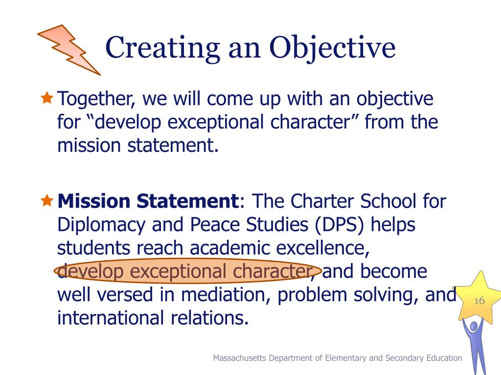 Creating an Objective • Together, we will come up with an objective for “develop exceptional character” from the mission statement. • Mission Statement: The Charter School for Diplomacy and Peace Studies (DPS) helps students reach academic excellence, develop exceptional character, and become well versed in mediation, problem solving, and international relations. Massachusetts Department of Elementary and Secondary Education
