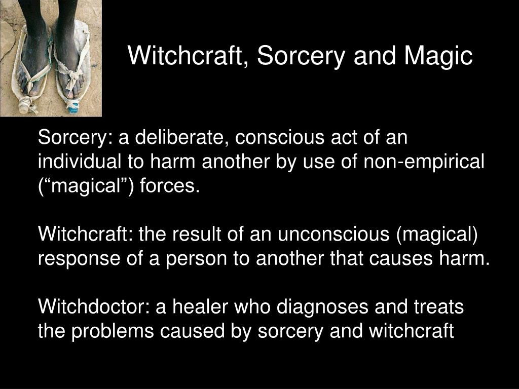 Witchcraft, Sorcery and Magic Sorcery: a deliberate, conscious act of an individual to harm another by use of non-empirical (“magical”) forces. Witchcraft: the result of an unconscious (magical) response of a person to another that causes harm. Witchdoctor: a healer who diagnoses and treats the problems caused by sorcery and witchcraft