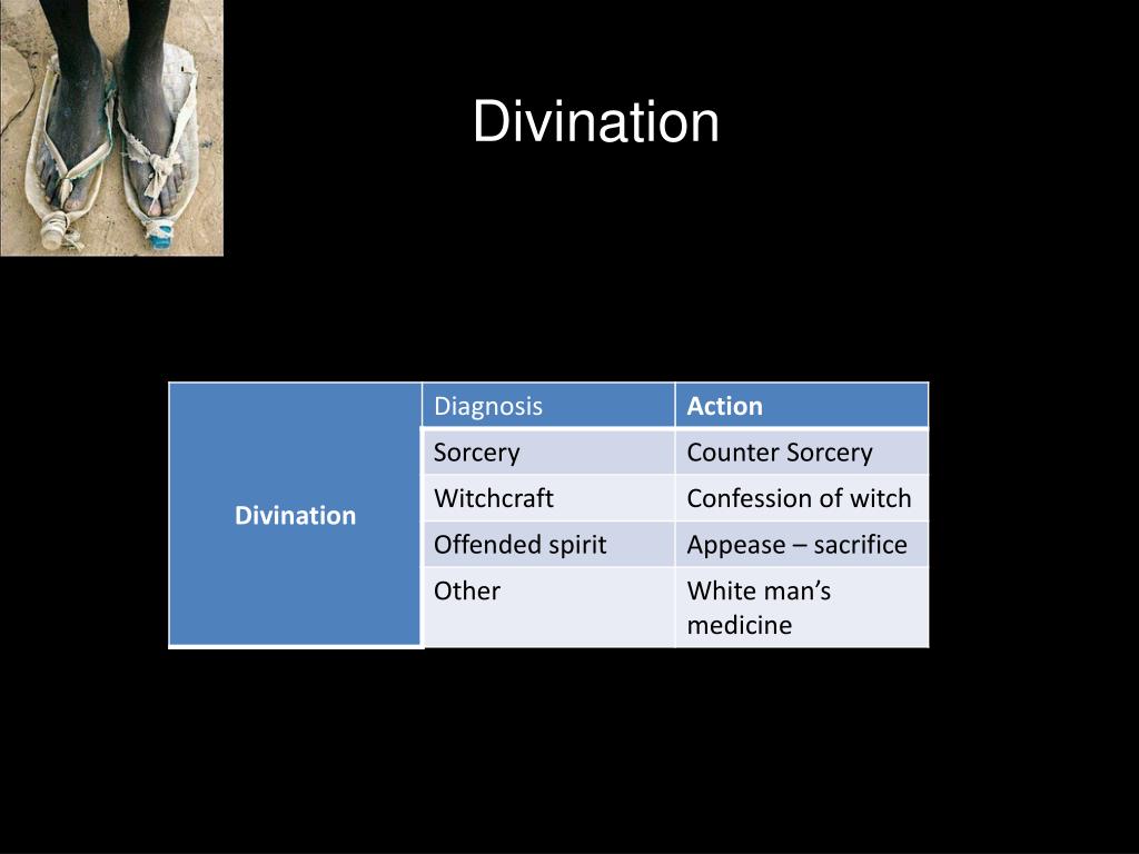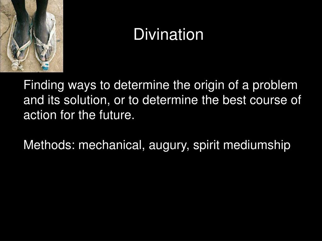 Divination Finding ways to determine the origin of a problem and its solution, or to determine the best course of action for the future. Methods: mechanical, augury, spirit mediumship