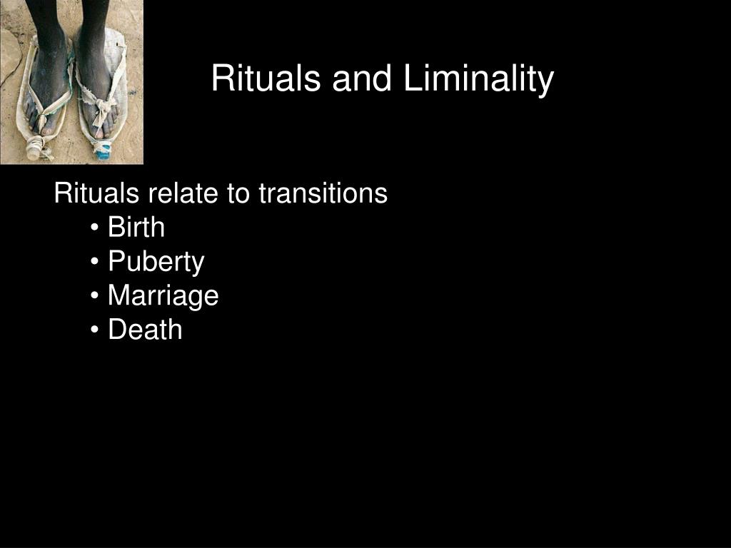 Rituals and Liminality • Rituals relate to transitions • Birth • Puberty • Marriage • Death